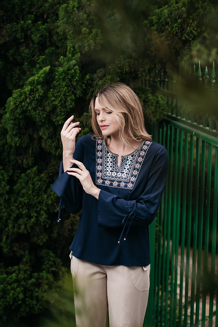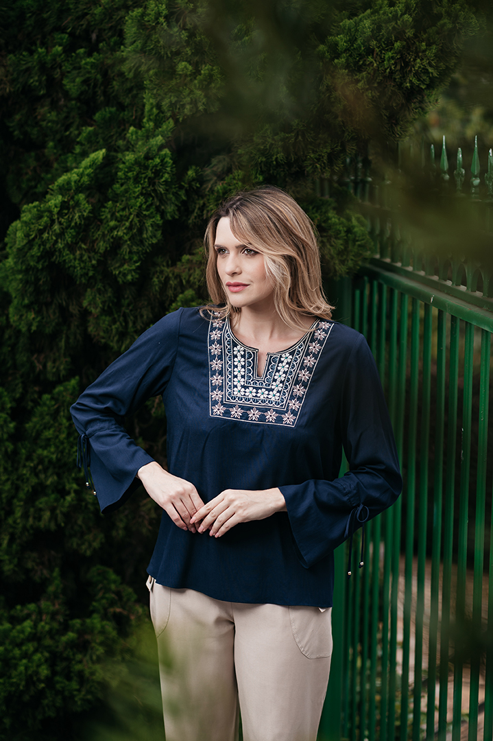 BLUSA DALVA PALA BORDADA EM VISCOLINHO MARINHO