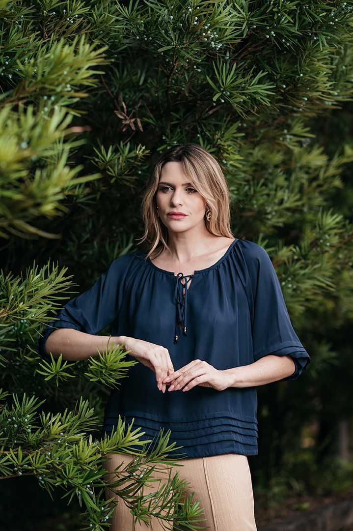BLUSA ELIANA PREGAS MANGA E BARRA EM CREPE MARINHO