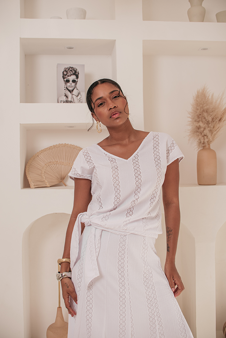 BLUSA FELICIA LAÇO BARRA EM MALHA BORDADA BRANCA