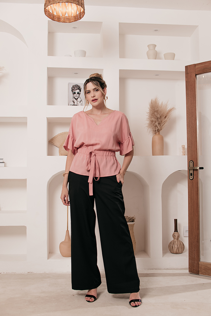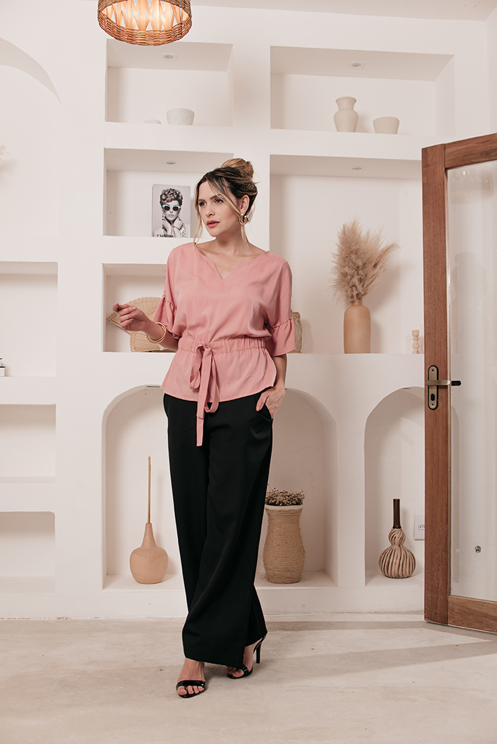 BLUSA LEA FRANZIDO NA CINTURA E FAIXA LAÇO EM VISCOLINHO ROSA