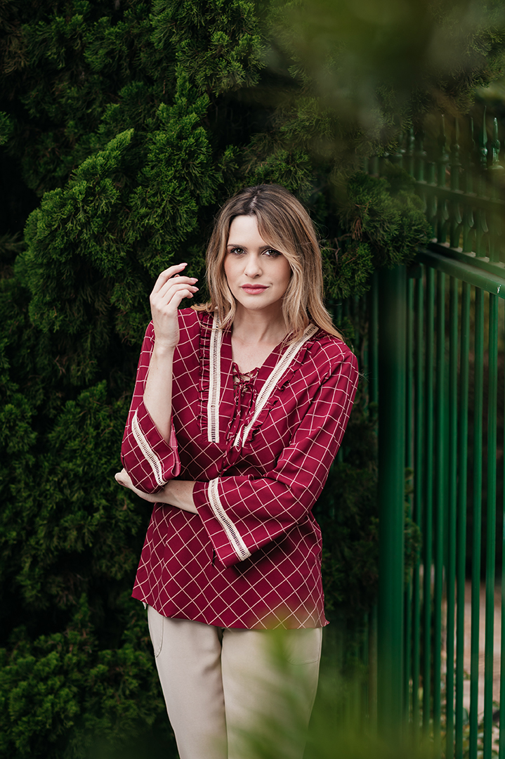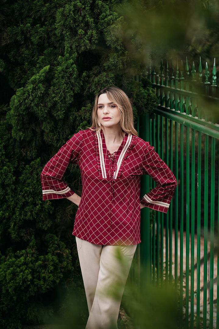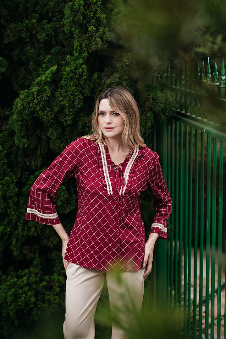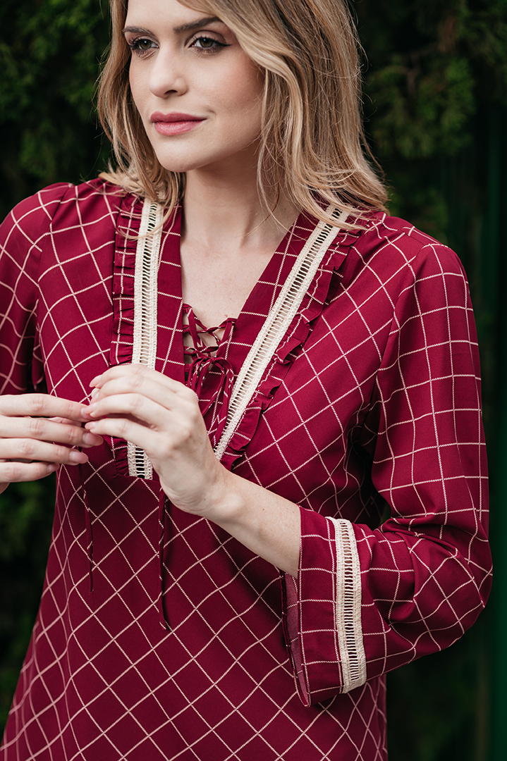 BLUSA LUCIANA PONTO PALITO E BABADINHO EM CREPE XADREZ