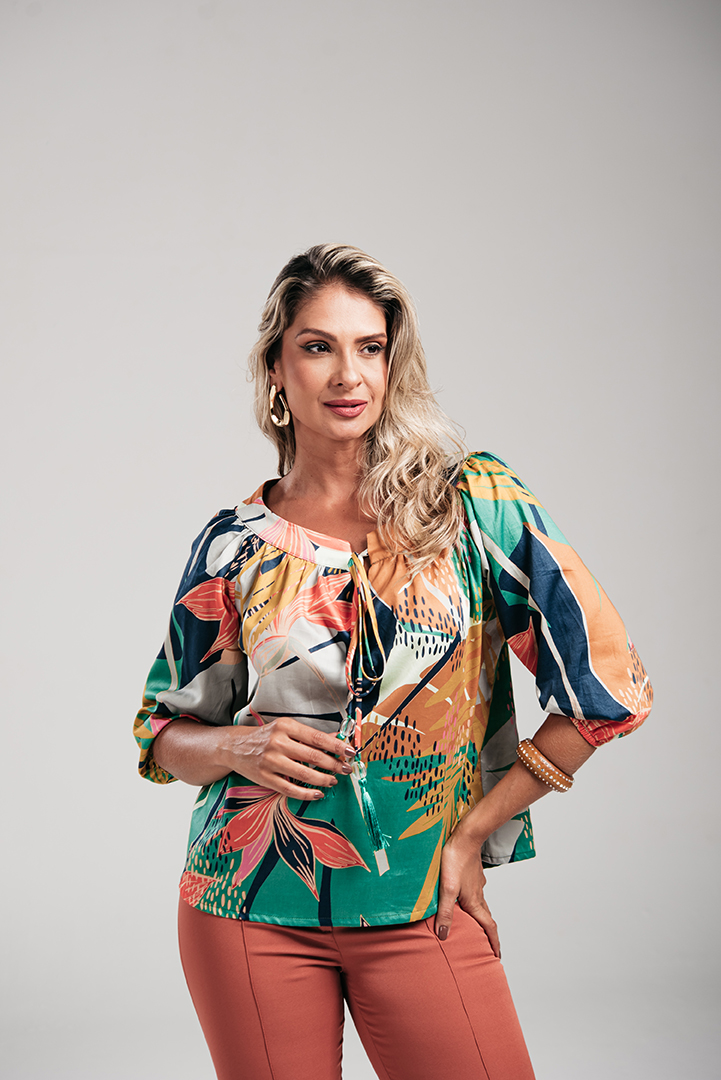 BLUSA MARA COM TASSEL EM CREPE ESTAMPADO
