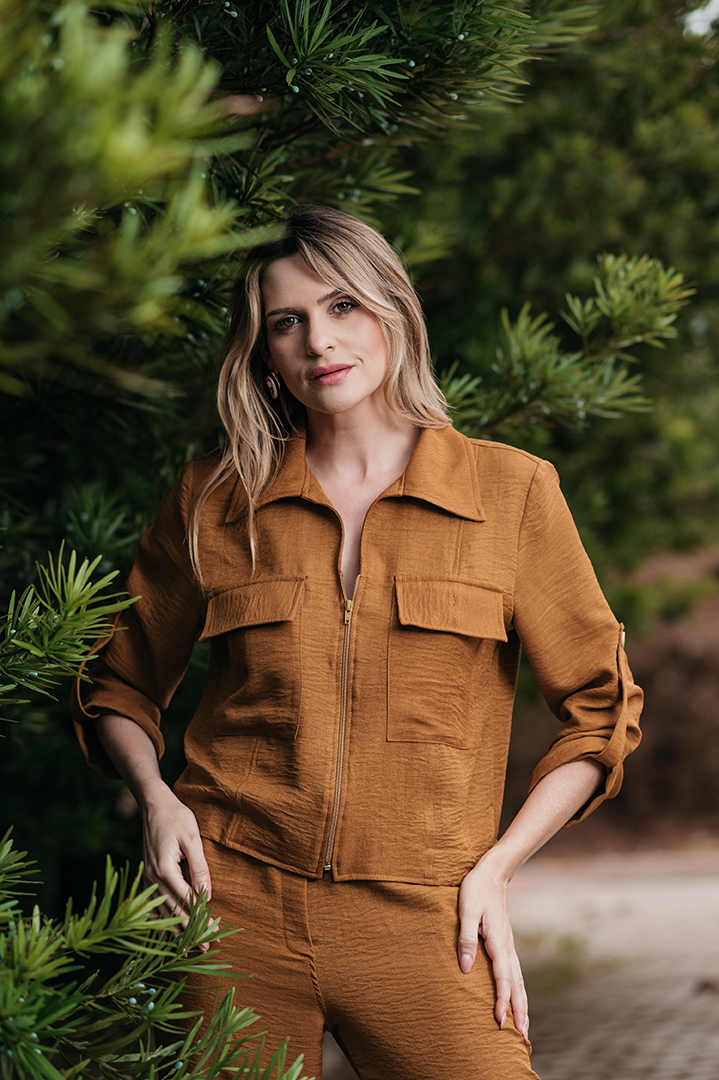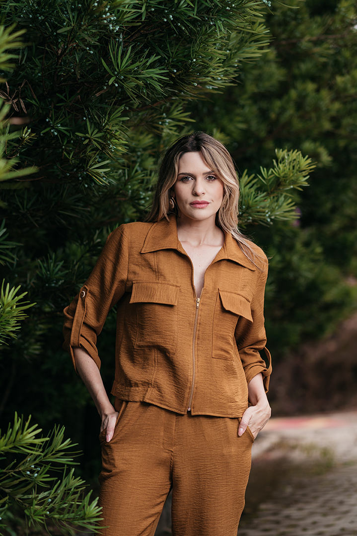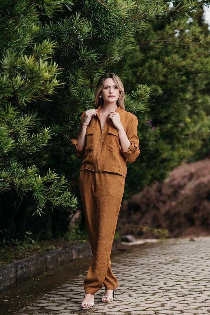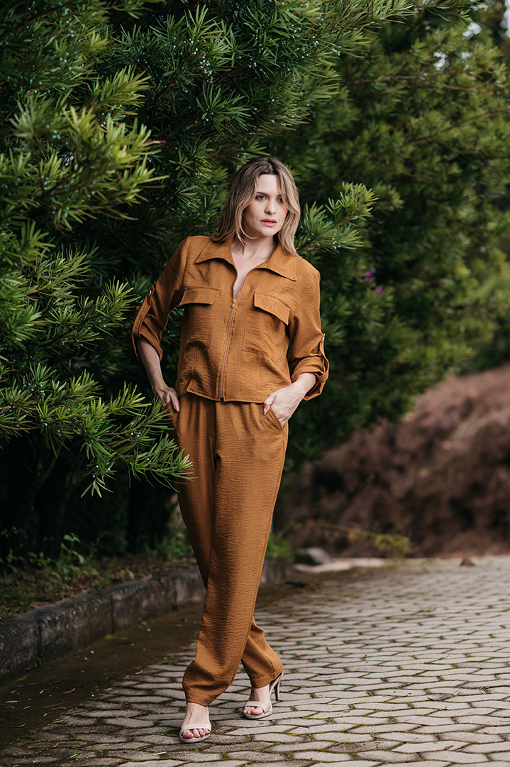 CONJUNTO AMANDA BLUSA ZIPER FRENTE E CALÇA ELASTICO CINTURA EM CREPE OCRE