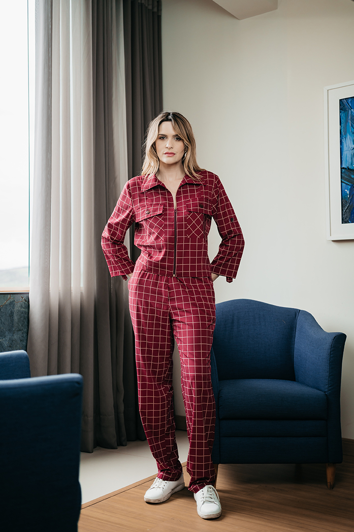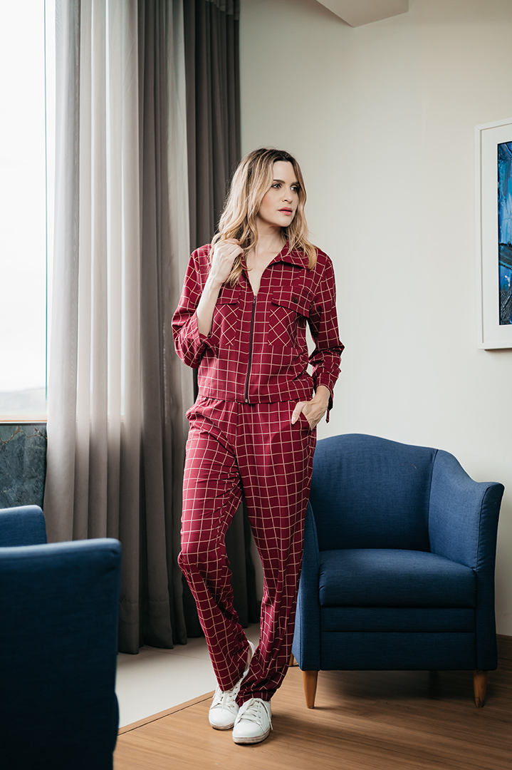 CONJUNTO AMANDA BLUSA ZIPER FRENTE E CALÇA ELASTICO CINTURA EM CREPE XADREZ