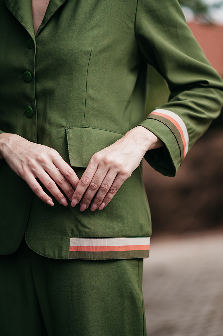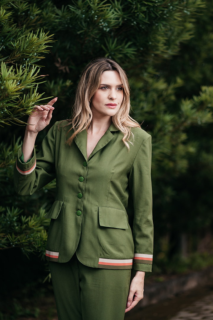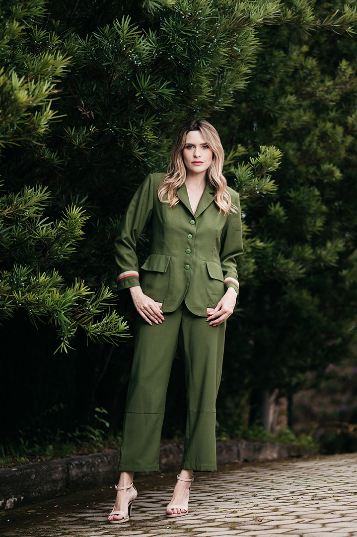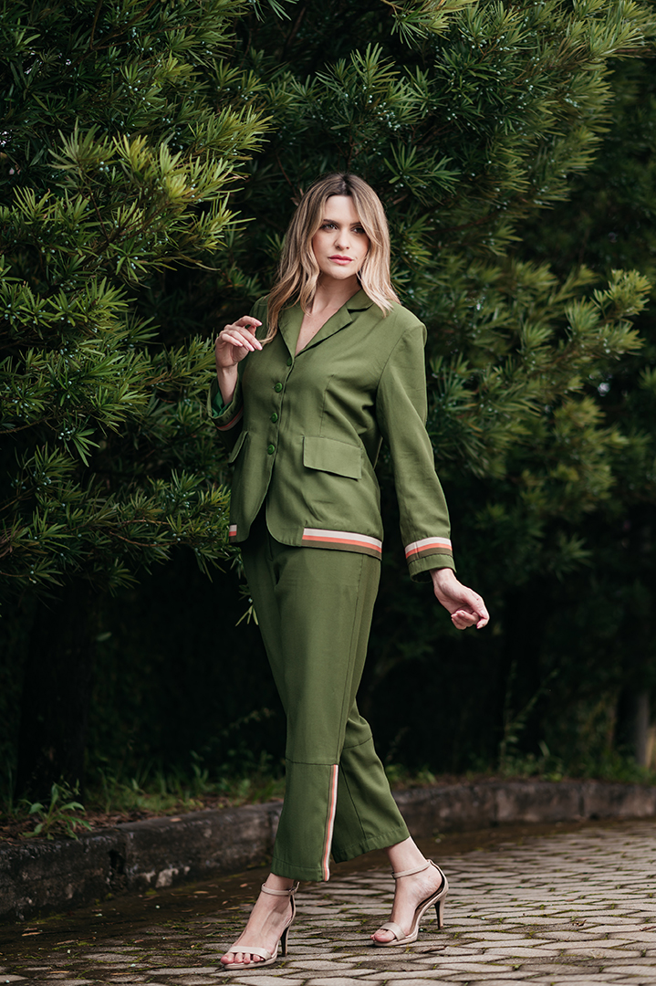 CONJUNTO CECILIA BLASER E CALÇA DETALHE ELASTICO LISTRADO EM CREPE VERDE