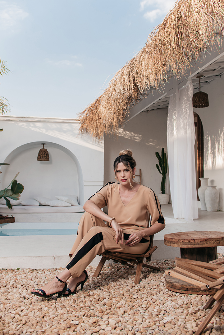 CONJUNTO GILDETE BLUSA E CALÇA FIVELA EM CREPE BEGE/PRETO
