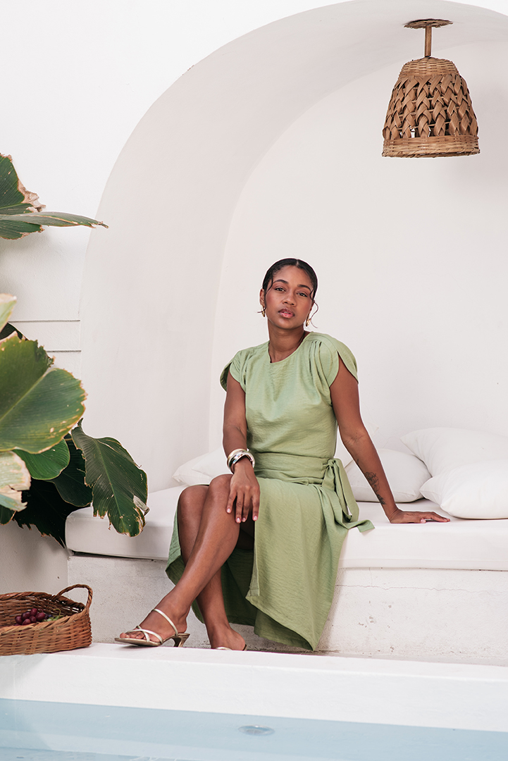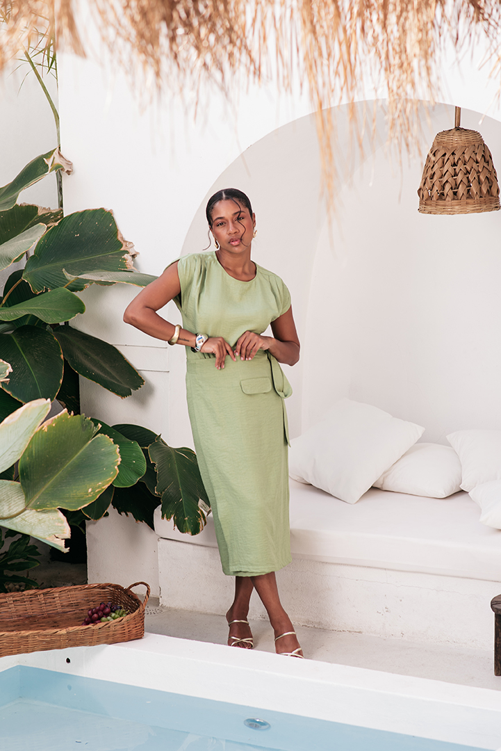 CONJUNTO LAU BLUSA PREGAS OMBRO E SAIA PAREO EM CREPE VERDE
