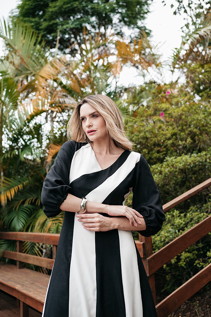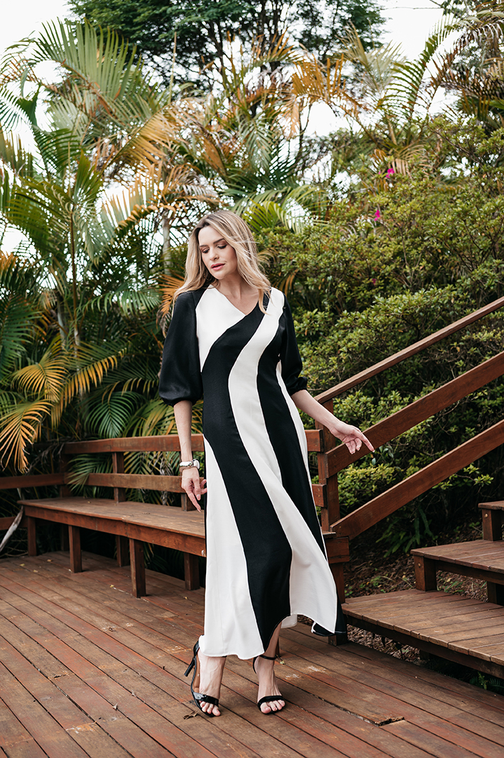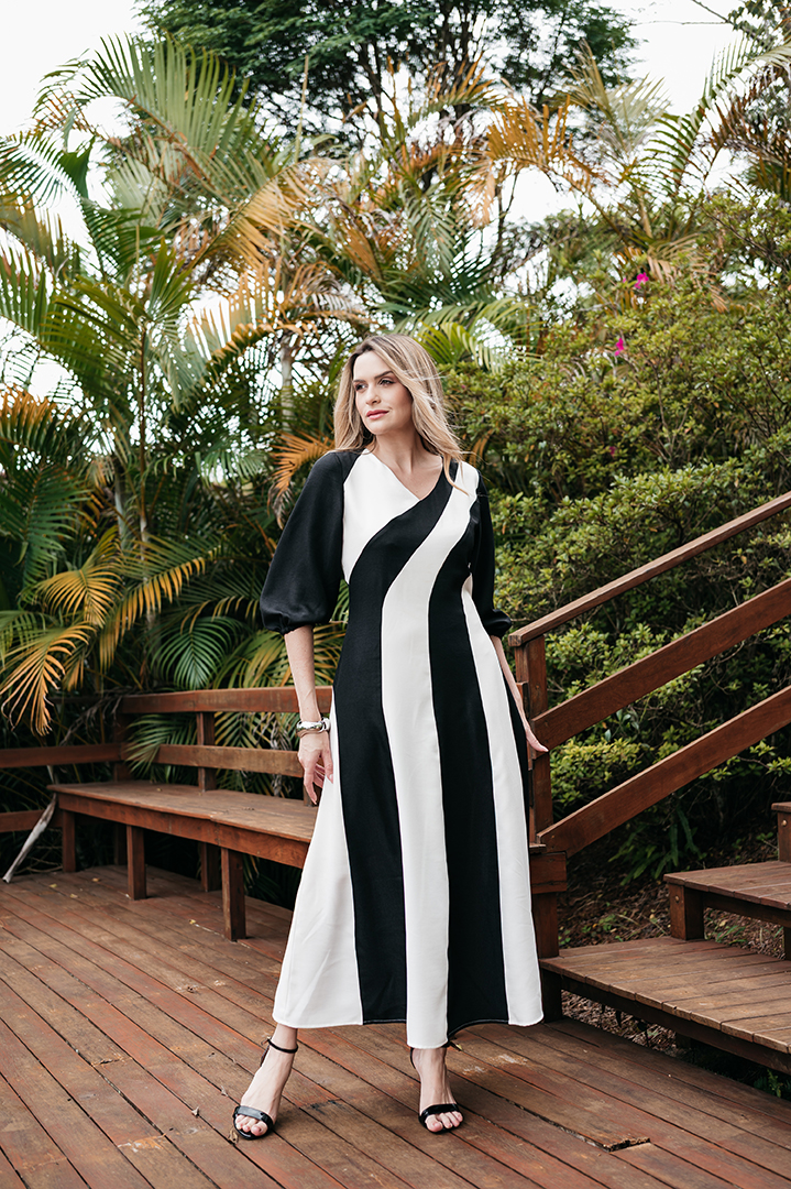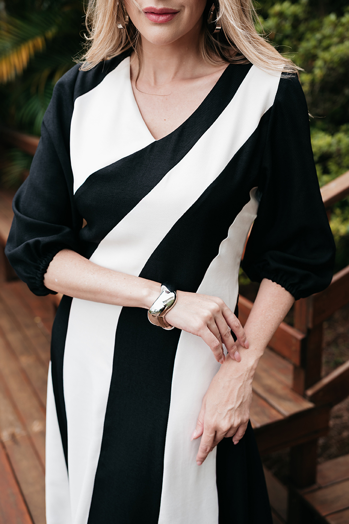 VESTIDO CELINA BICOLOS FAIXAS EVASES EM CREPE TWILL PRETO E BRANCO