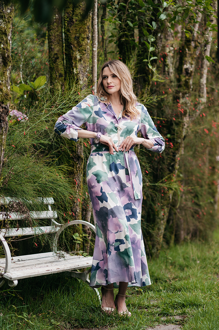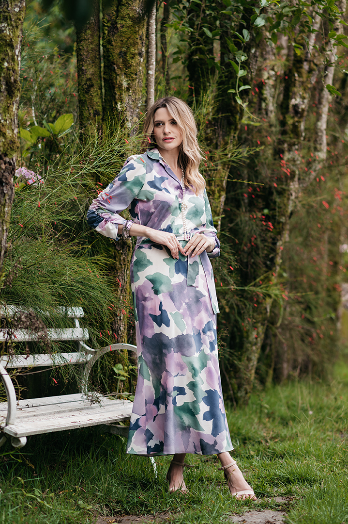 VESTIDO ELIZETE SAIA ENVIESADA EM SEDA ESTAMPA EXCLUSIVA ROXO