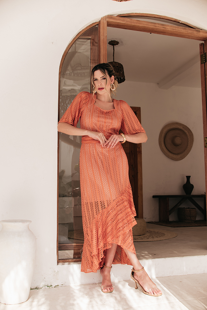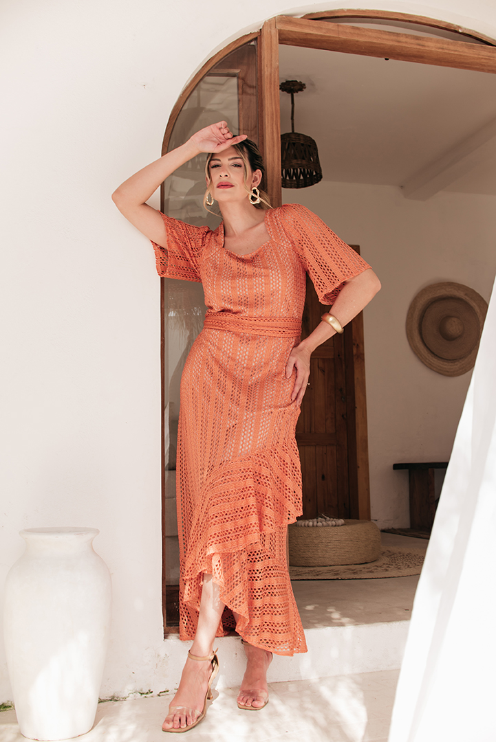 VESTIDO MARINA RECORTES JABOT EM TELA BORDADA CORAL