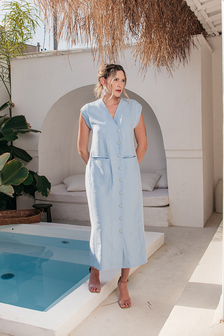 VESTIDO ROSE CHEMISE BOLSOS EM CREPE AZUL
