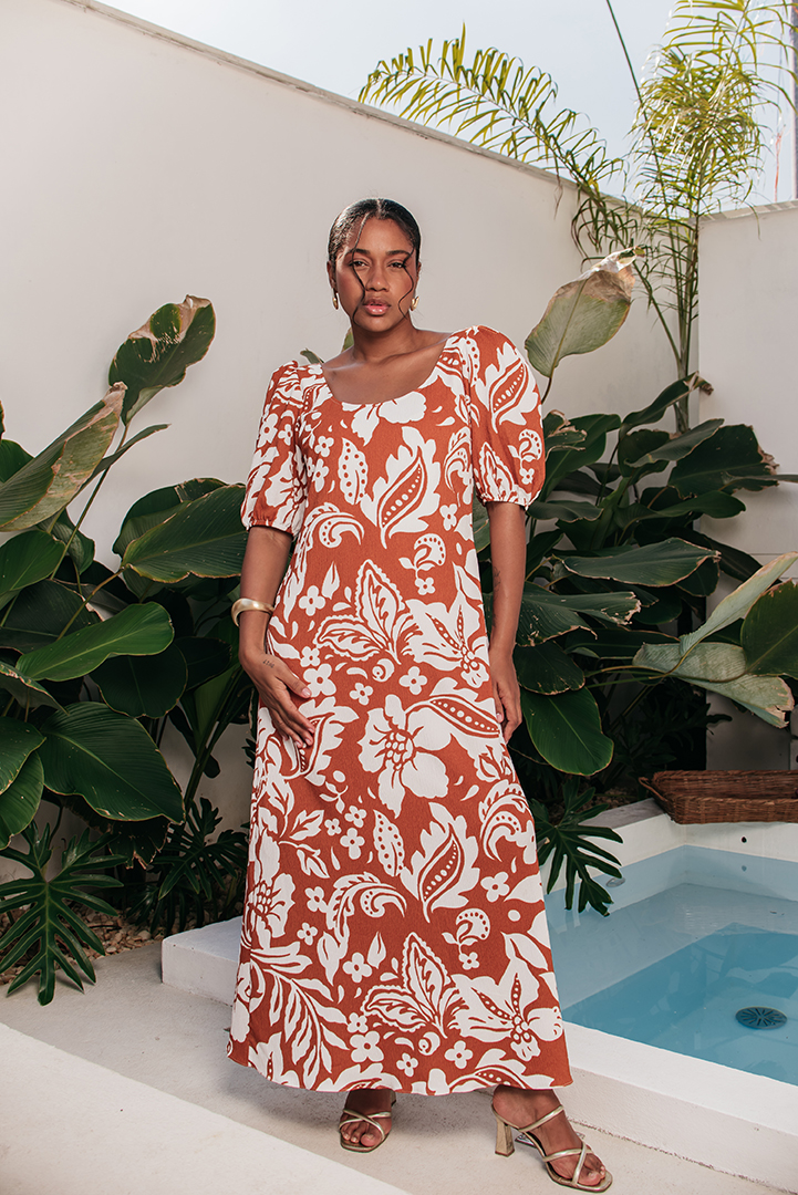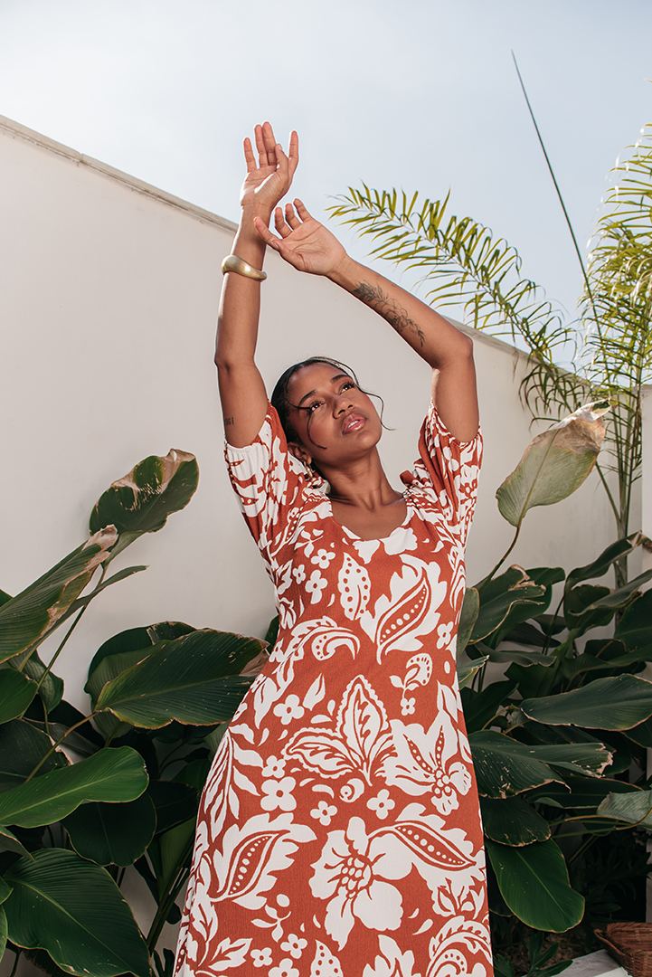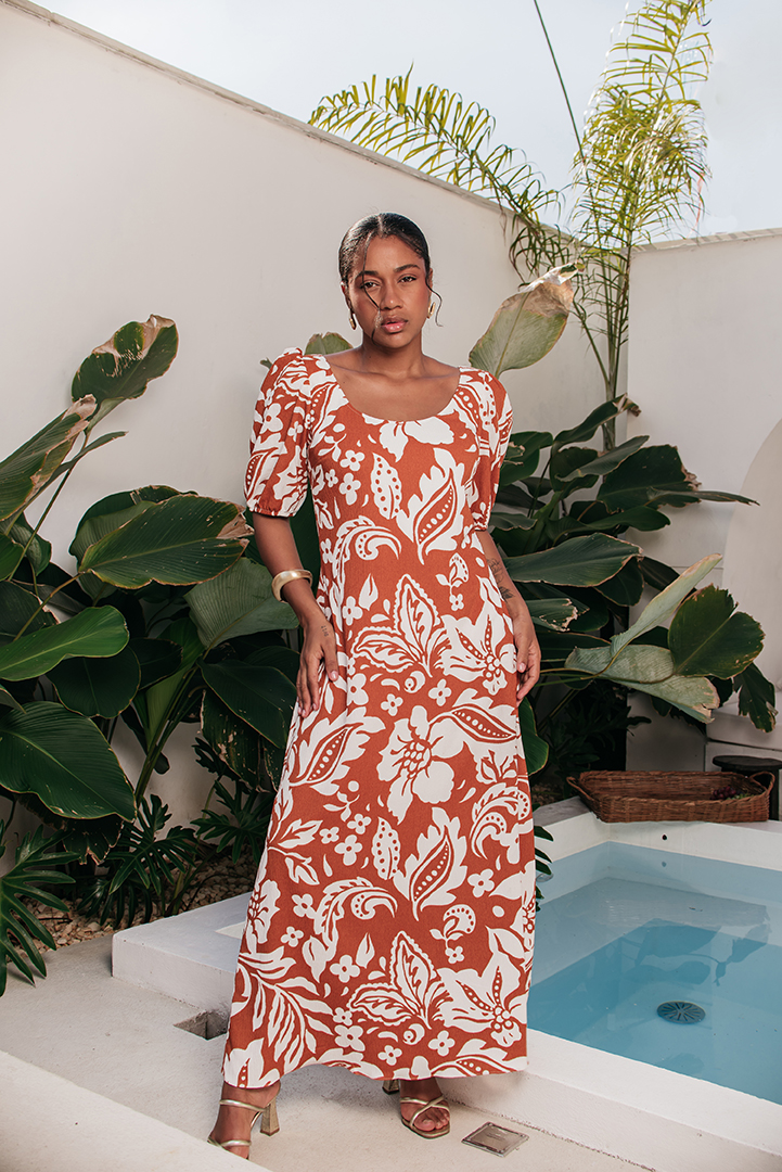 VESTIDO ZILDETE MIDI DECOTE REDONDO EVASE CREPE MALHA TERRA COTA